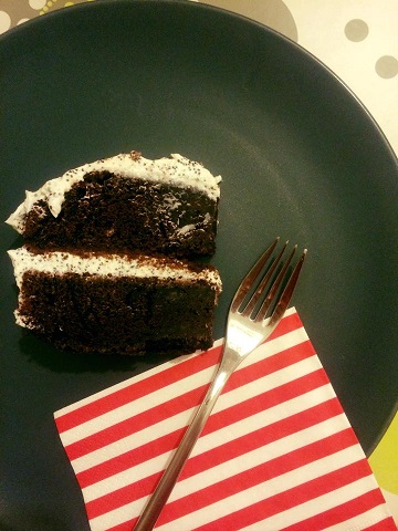 Pustíme sa do korpusov. Zmiešamie cukor(100g), kakao a vriacu vodu. Poriadne vymiešame a necháme stáť. V druhej si premiešame múku so sódou a práškom do pečiva. V tretej, väčšej miske si vymiešame maslo s cukrom(130g) metličkou. Pridáme vanilku, klepneme jedno vajce, rozmiešame. Pridáme časť múky a časť kakaovej zmesi a opäť premiešame. Násladne klepneme druhé vajce a po jeho premiešaní vsypeme ostatnú múku a vlejeme všetku kakaovú zmes. Vznikne krásne homogénne cesto s nádychom Afriky.
