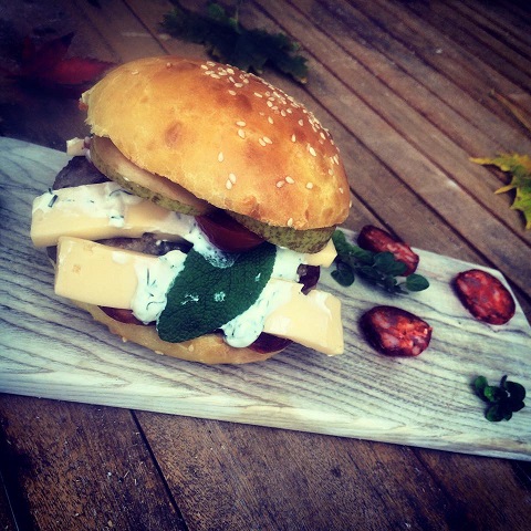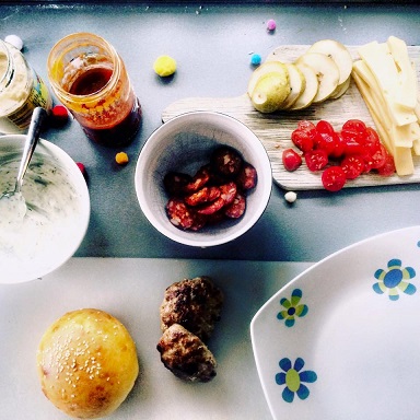 Na zostavenie finálneho hambágera použijeme všetko, čo nám chutí- kečup, horčicu, kôprový dip, šalát, cibuľu a- MOMENT PREKVAPENIA- plátok jablka!