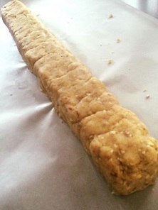 - Pomleté mandle, múky a cukor premiešame spolu. Pridáme rozpustené maslo, kôru z citróna a vajce. Premiešame a ak je potrebné, prilejeme trošku mlieka. Vypracujeme cesto, ktoré si dáme na papier na pečenie- odporúčam dosť dlhý. Rukami vytvarujeme cesto do hranola, zabalíme a dáme do chladničky minimálne na hodinu, môžeme však nechať aj cez noc.