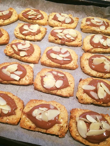 Na týchto keksíkoch sa mi páči ich tvárnosť. Môžu sa nakrájať na obdĺžniky a čokoládu len nadávkovať lyžičkou navrch. Vkusne dozdobené mandlami vytvárajú slávnostný efekt.