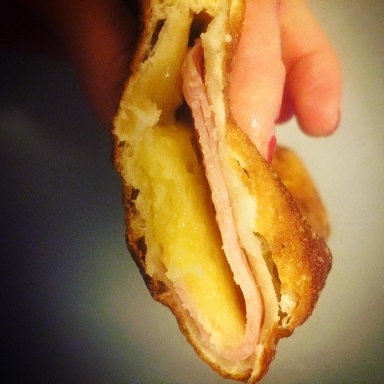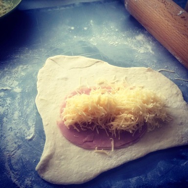 Valčekom vyvaľkáme natenko. Do polovice položíme 2 plátky šunky, nastrúhaný syr- čím viac sa podarí vopchať, tým lepšie - pár lístkov oregána a preložíme, kraje poriadne pritlačíme. Vznikne nám kapsa.