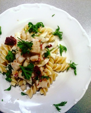 Cestoviny zlejeme. K feniklu nožnicami nastriháme sušené paradajky, 2/3 z pripravenej petržlenovej vňate a chilli papriku.